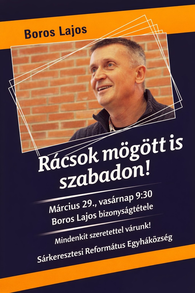 Boros Lajos bizonyságtétele (Rácsok mögött is szabadon) Egy elítélt vallomása és valódi szabadulása. Akit 20 év börtön nem, de Jézus megváltoztatott. Mindenkit szeretettel vár a Sárkeresztesi Református Egyházközség