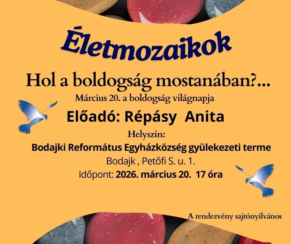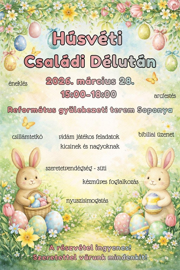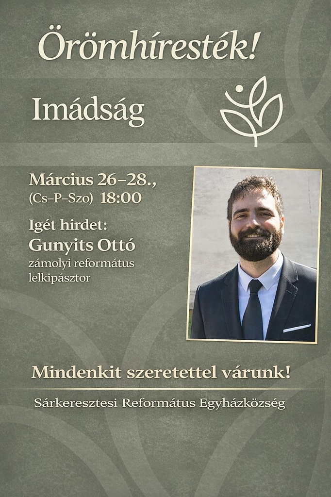 Örömhíresték március 26-28. este 18:00 kezdettel! Vendégünk Gunyits Ottó zámolyi református lelkész lesz! Téma: ImádságMindenkit szeretettel várunk!