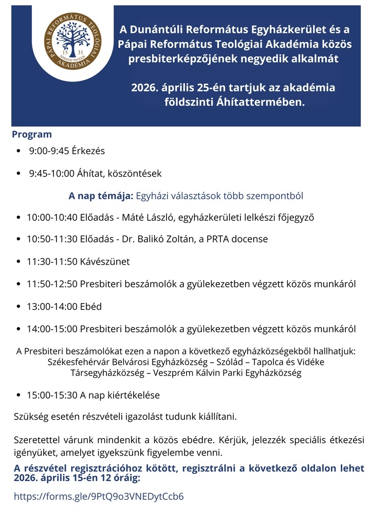 A Dunántúli Református Egyházkerület és a Pápai Református Teológiai Akadémia áprikis presbiterképzőjének a témája az egyházi választás lesz. Részletes program: