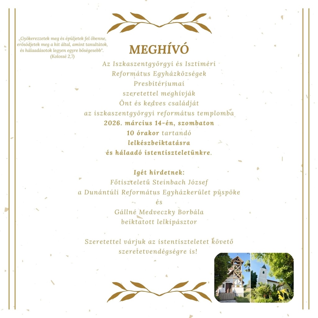 Szeretettel hívunk a 2026. március 14-én tartandó lelkészbeiktatásra minden kedves testvérünket a Mezőföldi Egyházmegye gyülekezeteiből!