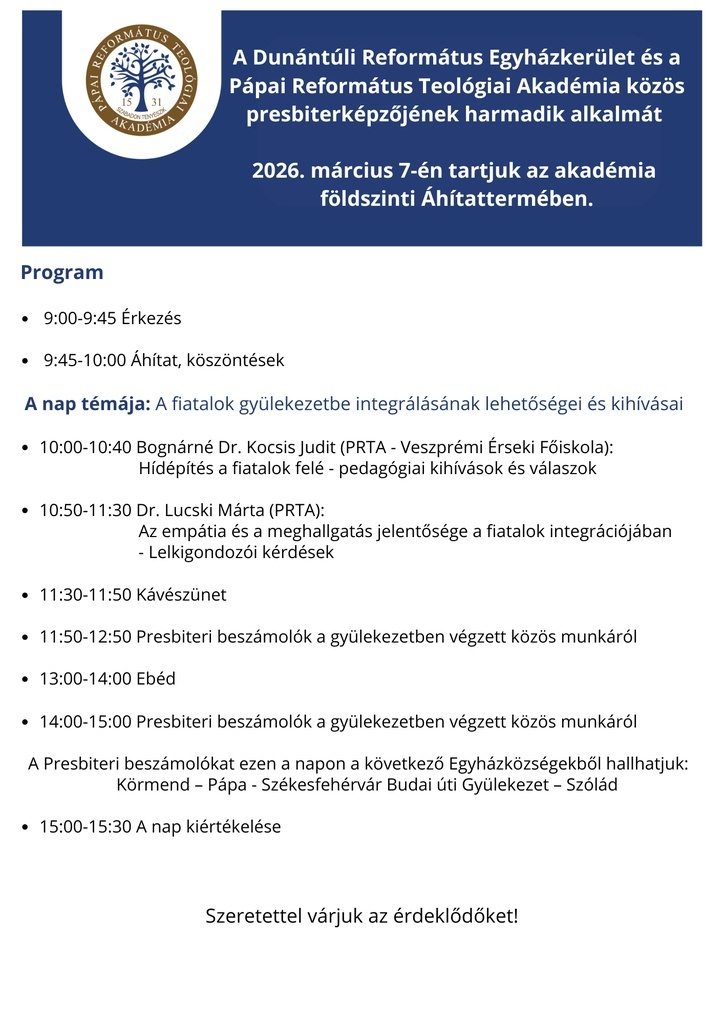 2026 tavaszán folytatódik a Dunántúli Református Egyházkerület és a Pápai Református Teológiai Akadémia Presbiterképző rendezvényeinek sora. A Következő alkalomra március 7-én kerül sor. A nap témája a fiatalok gyülekezetbe integrálásának lehetőségei és kihívásai lesz.