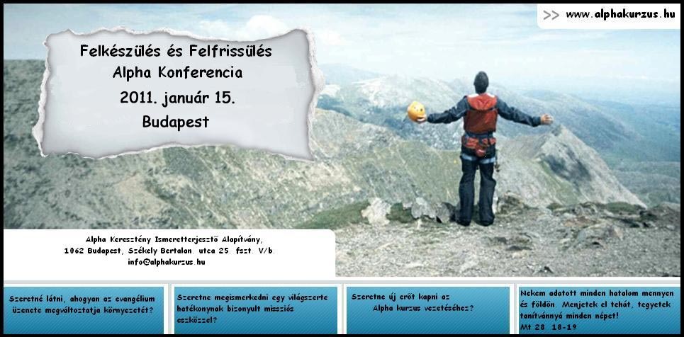 A konferencia időpontja 2011. január 27-29., helyszíne Berekfürdő. A konferenciára szeretettel hívjuk és várjuk egyházközségeink lelkipásztorait az egész Kárpát-medencéből, valamint gyülekezetenként néhány aktív tagot, akik szeretnének új lehetőségeket megismerni, illetve saját tapasztalataikat továbbadni, megosztani a témában.