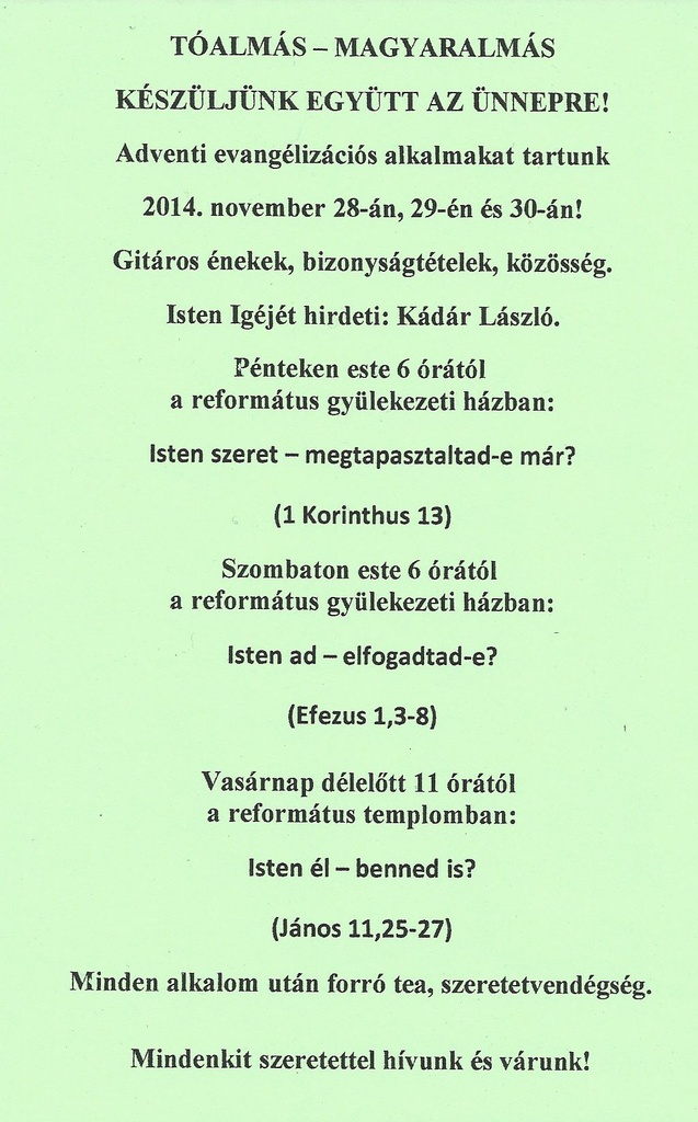 2014. november 15-16. napjain Mór vár bennünket, hogy megismerkedjünk a várossal és a borvidékkel. Kérem tekintsék meg csatolt programunkat és amennyiben szívesen töltenének el egy kellemes és szakmai szempontból is bizonyára hasznos hétvégét, jelentkezzenek, jöjjenek el. Köszönjük, ha a gyülekezet tagjainak, ismerőseinek és barátainak is felhívja a figyelmét erre az eseményre.