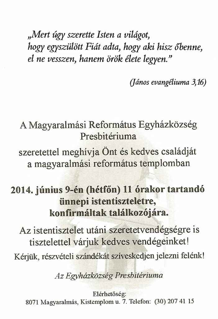 Április 21 (hétfő) 10:00 Húsvéti úrvacsorás istentisztelet
