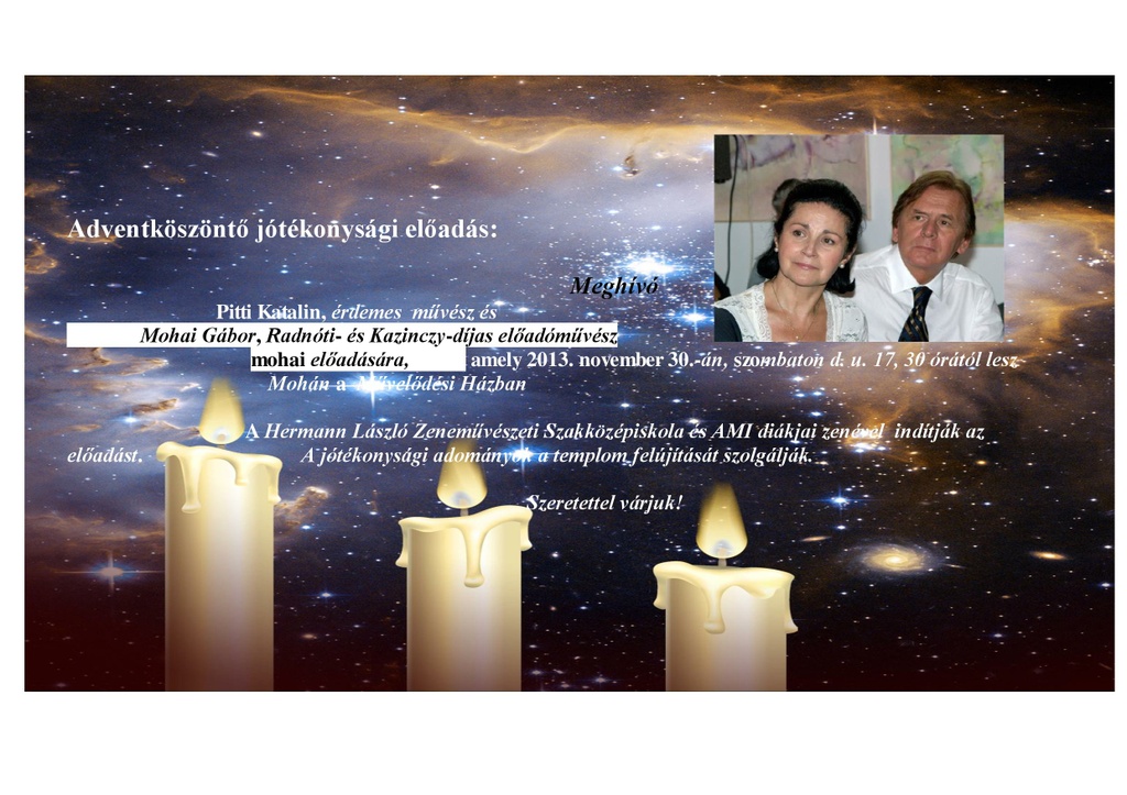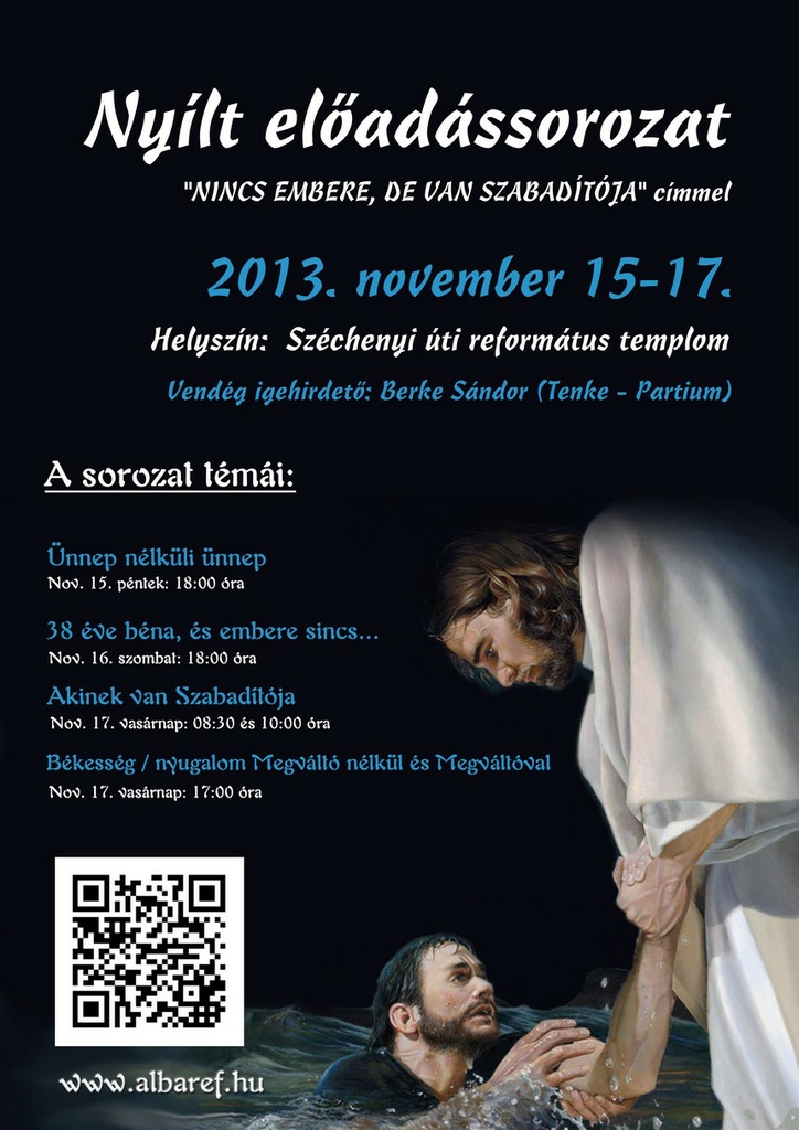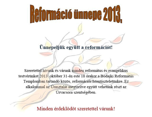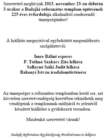 2013. október 27-én vasárnap fél 11 órakor kezdődő istentiszteleten hálát adunk Istennek az évszázadokon át megtartó szeretetéért és a jelenben megtapasztalt hatalmáért. Bár jól tudjuk és emberileg nagyon köszönjük a mester emberek áldozatos munkáját, a Mezőgazdasági és Vidékfejlesztési Hivatal anyagi támogatását, hisszük, hogy mindezek mögött Isten irántunk való jóságát tapasztalhattuk meg. Szeretettel hívunk mindenkit erre a vasárnap délelőttre, hogy együtt ünnepeljünk és örüljünk a felújított templomunknak. Hiszem, hogy aki eljön az kincset talál: Jézus jelenlétét, Isten igéjének gyógyító hatalmát, az imádság kiapadhatatlan forrását. Az ünnepi istentiszteleten Steinbach József a Dunántúli Református Egyházkerület püspöke hirdeti a Szentírás örömüzenetét, ezt követően mindenkit várunk szeretetvendégségre.