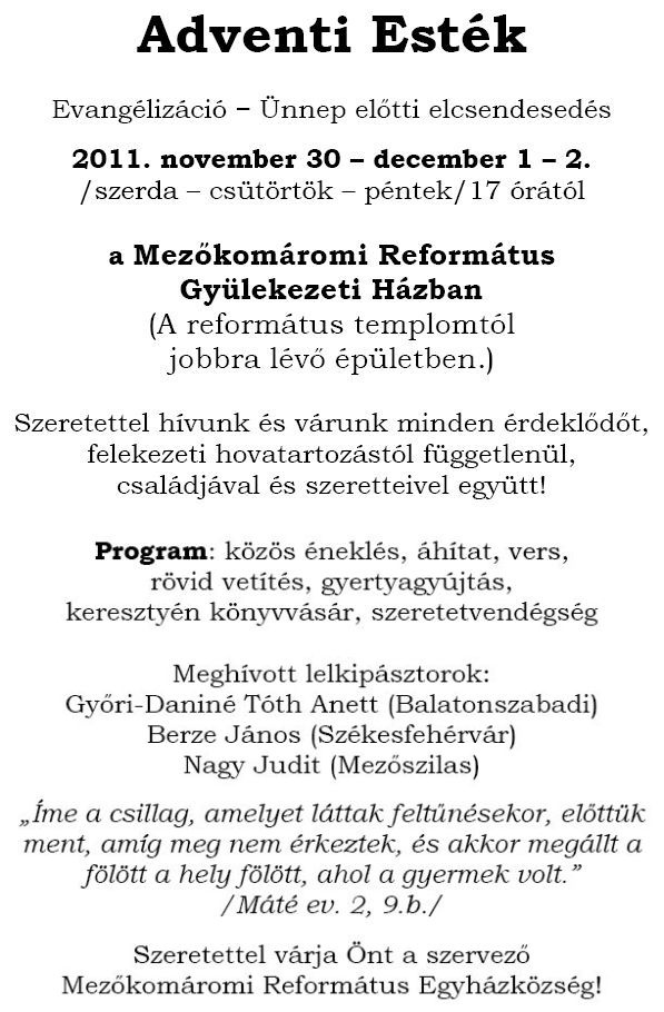A gyülekezet minden érdeklődőt szeretettel vár rendezvényére,