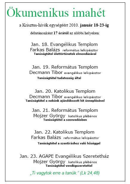 Hagyományainknak megfelelően az idei esztendőben is megrendezésre kerülnek községünkben az ökumenikus alkalmak.
