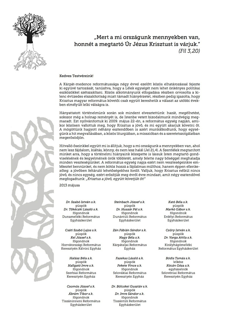 A Kárpát-medence reformátussága négy évvel ezelőtt közös elhatározással fejezte ki együvé tartozását, tanúsítva, hogy a Lélek egységét nem lehet önkényes politikai eszközökkel szétszakítani. A tovább mögött olvashatják a Generális Konvent Elnökségének körlevelét, valamint letölthetik az ünnepi istentiszteletre vonatkozó javaslatot.