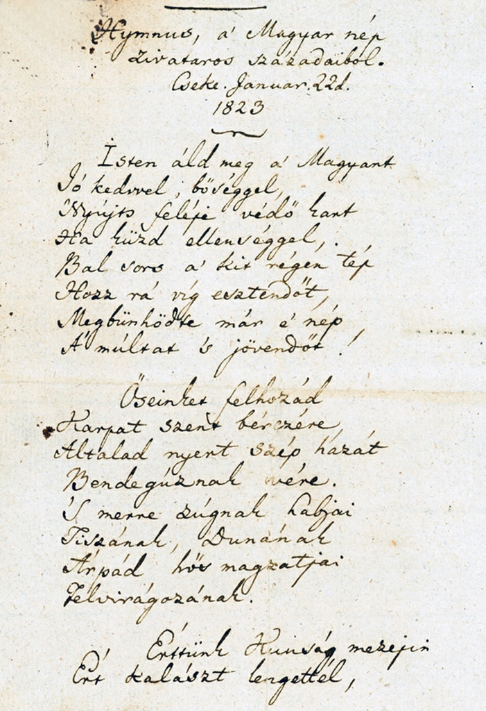Néhány hónappal később Kölcsey Hymnusának megzenésítésére is pályadíjat tűztek ki. A népes bírálóbizottságban Erkel nem szerepelt, ezért - jeligésen, mint a többi pályázó - beküldhette ő is alkotását, ami végül méltán nyerte el a magyar közönség tetszését. Ma is Erkel alkotása a hivatalos magyar Himnusz zenéje. Ismerve a politikai helyzetet, látva, hogy a magyar ! az Osztrák-Magyar Monarchia elnyomottja, elképzelhetjük a nép életérzését. Feltételezhetően Erkel Ferenc is hasonlóan érzett, s ez késztette a dallam megírására.