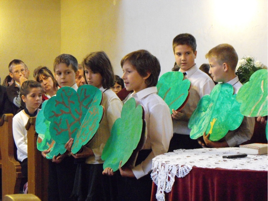 A gyermekek elgondolkodtató, léleképítő történettel szolgáltak az ünneplő gyülekezetnek. A hársfa, mely levélmilliárdos szeretett volna lenni, úgy döntött, hogy ősszel nem hullajtja el a levelét, mint a többi fa, és tavaszra már neki lesz a legtöbb levele, majd évről évre egyre több. A földi kincsekhez való ragaszkodás azonban az életébe került. A le nem hullajtott levelei megfojtották. A mennyben kell kincset gyűjtenünk, üzeni nekünk ez a kis történet, mert ahol a kincsünk, ott a szívünk is.