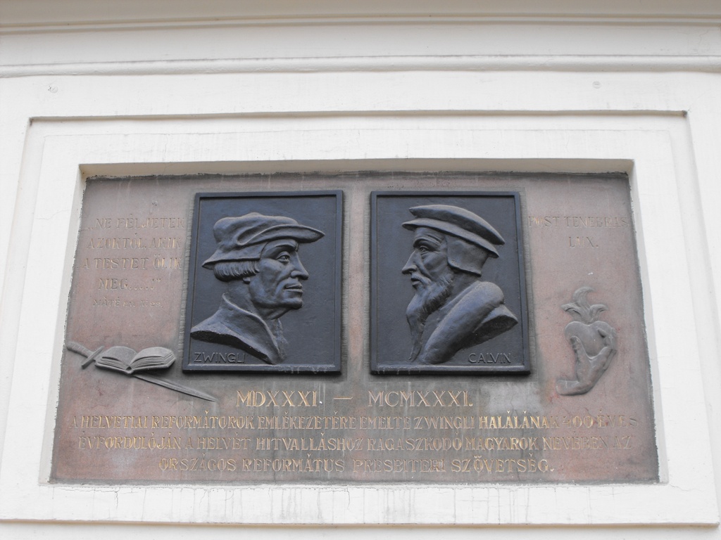 Az 1931-es emléktábla Zwingli és Kálvin portréjával